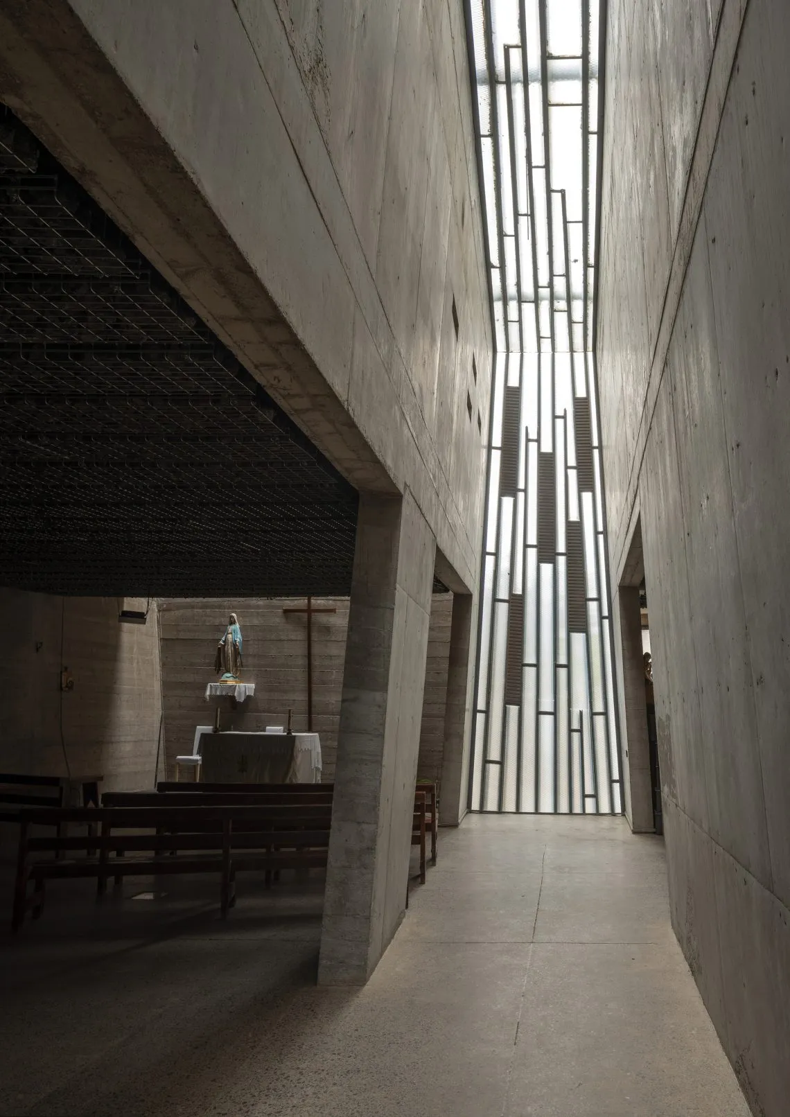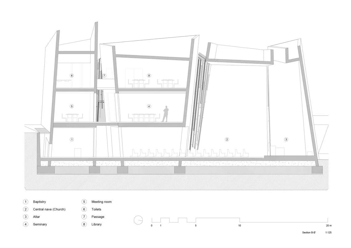 Dnevna svjetlost je ključni arhitektonski element koji oblikuje introvertiran, strog prostor koji poziva na razmišljanje. Bez prozora, zgrada je osvijetljena neglaziranim križem i zenitalnim svjetlom. Tijekom dana, promjenjiva svjetlost ističe različita područja, vodeći korisnike kroz istraživanje interijera.