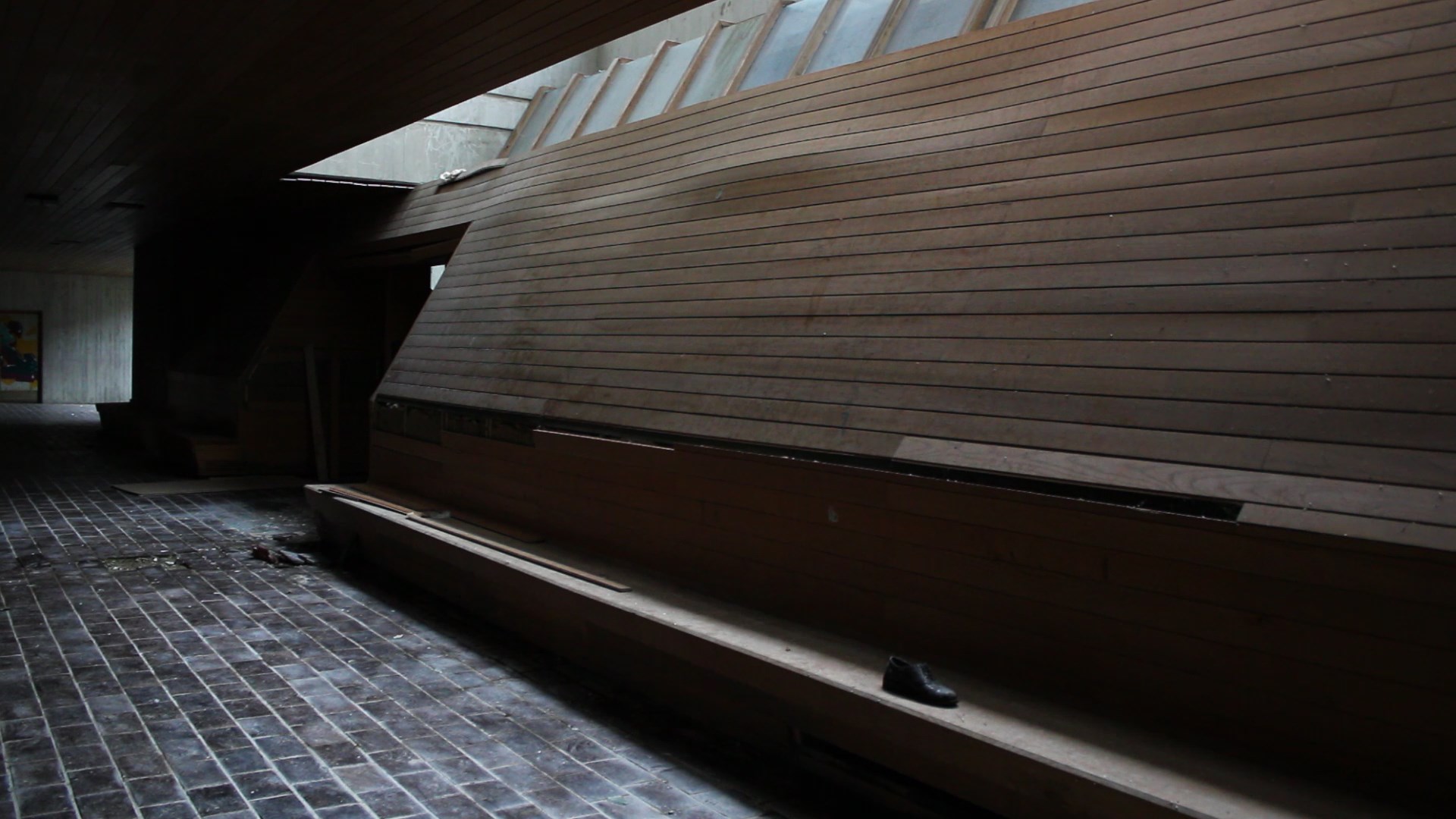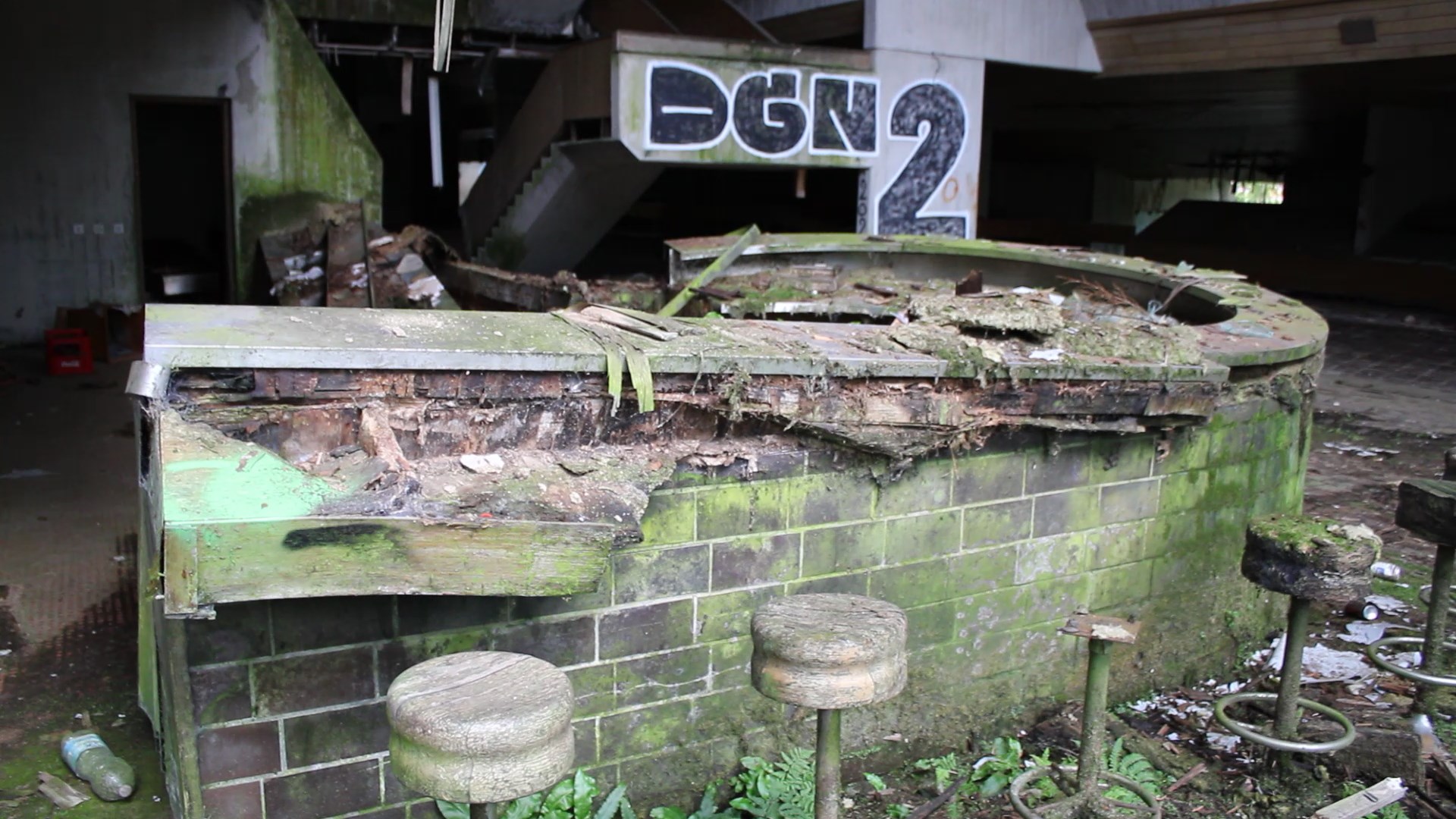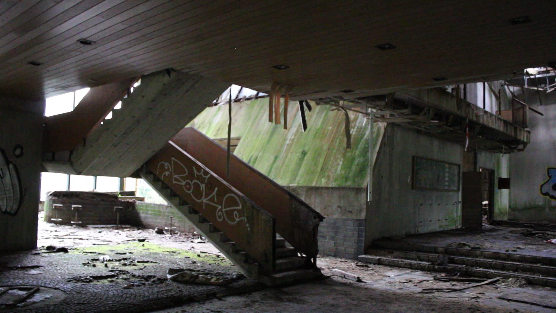 Pokraj šanka proteže se betonsko stepenište s velikim drvenim rukohvatima koje vodi na više katove. Zgrada ima sveukupno 3 kata i svi prolaze cijelom dužinom zgrade. Jedino je treći „odrezan“ do pola i proteže se samo polovicom zgrade. Dugački hodnici ukrašeni su glomaznim betonskim cvjetnjacima u kojima danas više ne raste ništa.