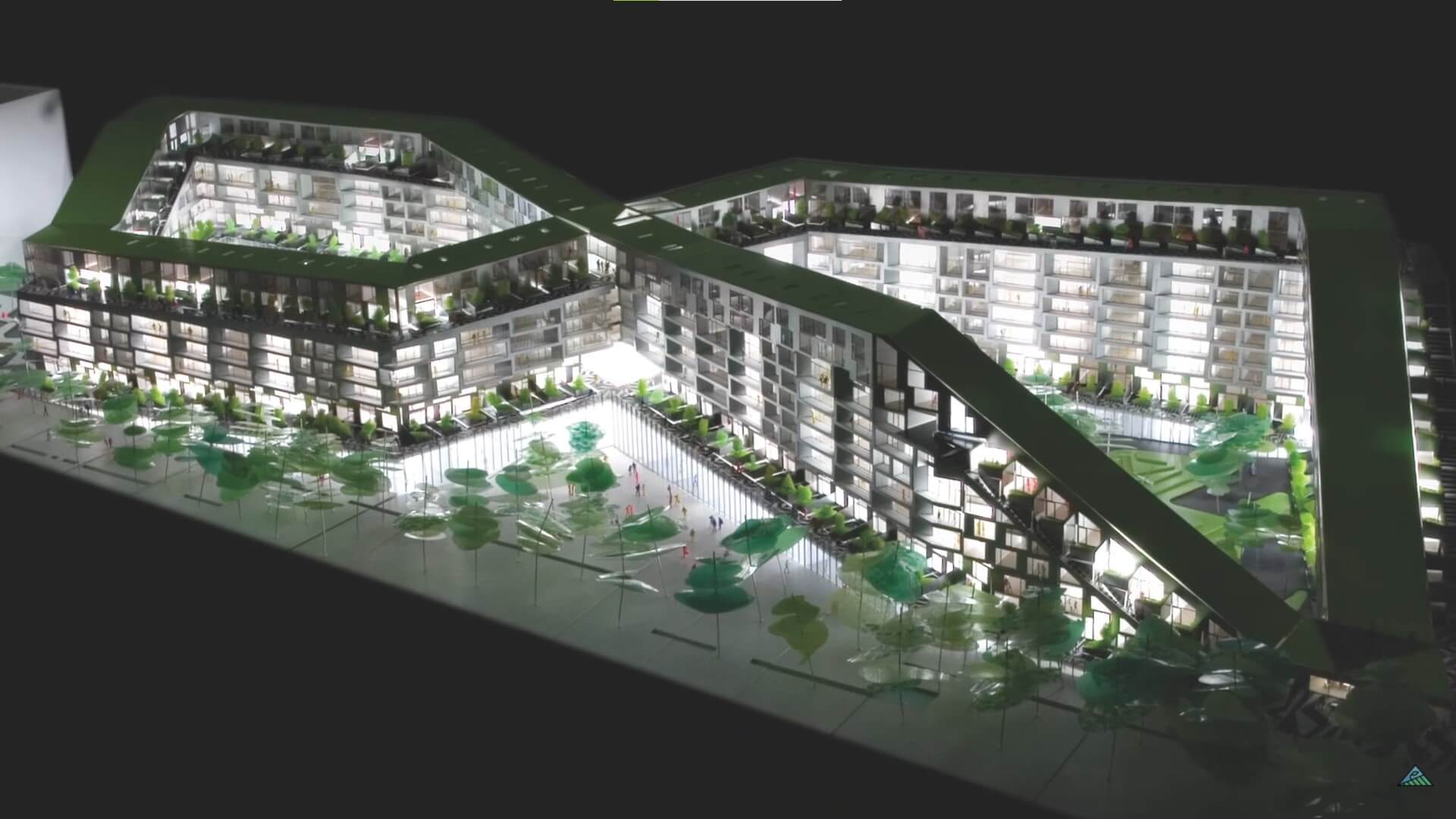 Oazu zelenila unutar zgrade, da se slikovito izrazimo, možete potražiti unutar dva kruga broja osam. Svaki od krugova je ujedno i dvorište s oko 500 kvadrata. Unutar kompleksa se također nalazi i prolaz s istoka na zapad zgrade, odnosno od parka do vodenih kanala.