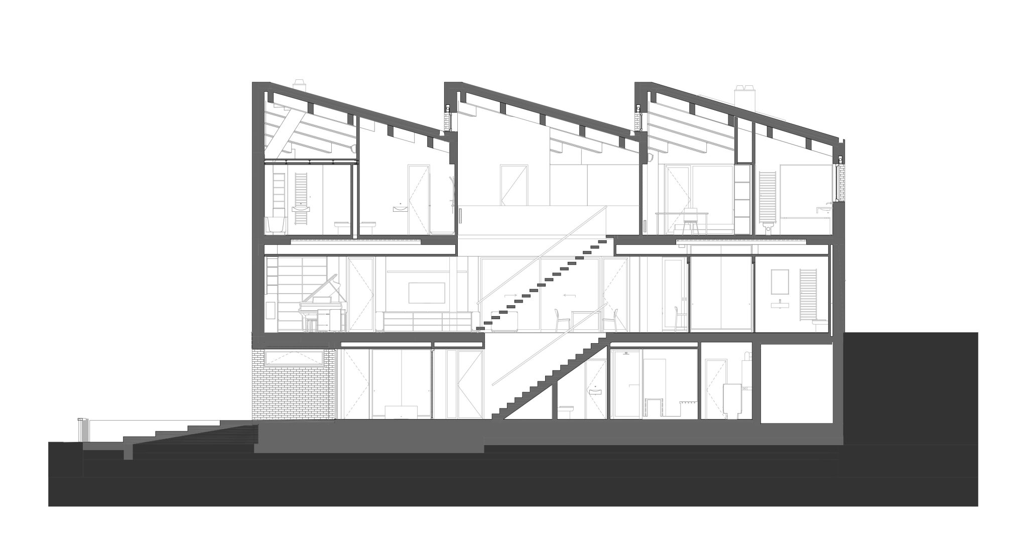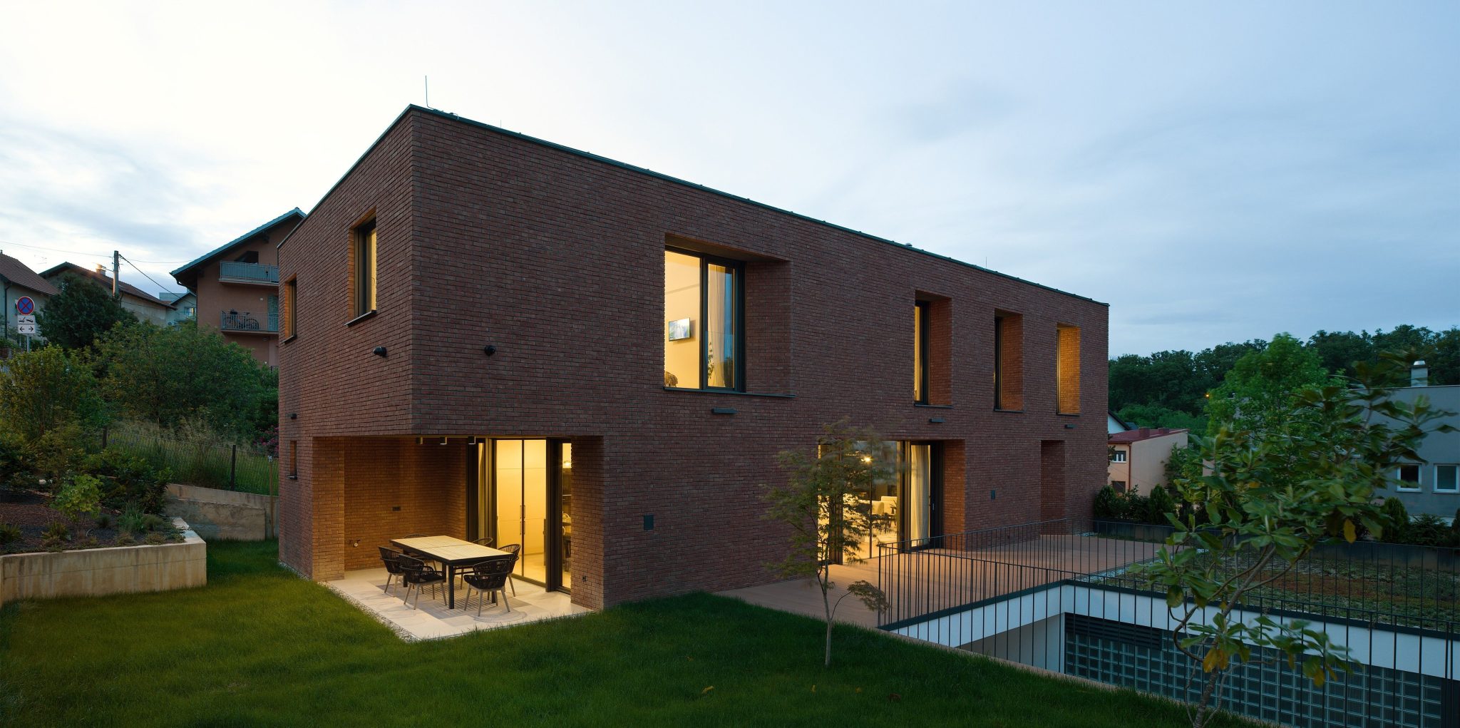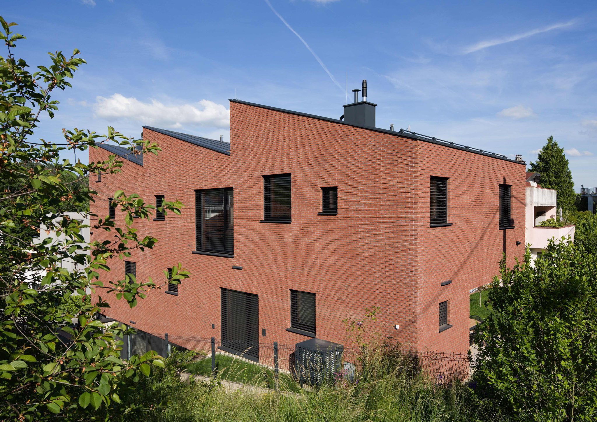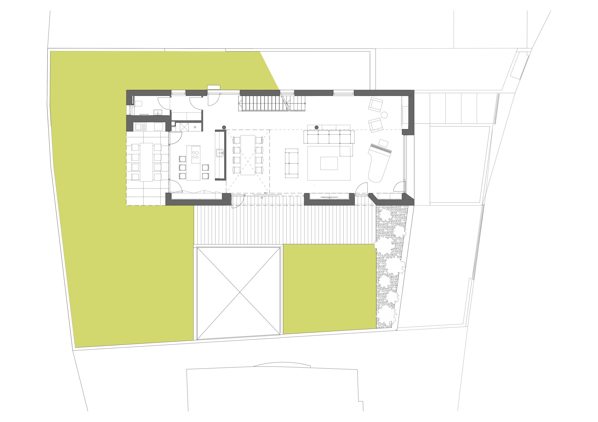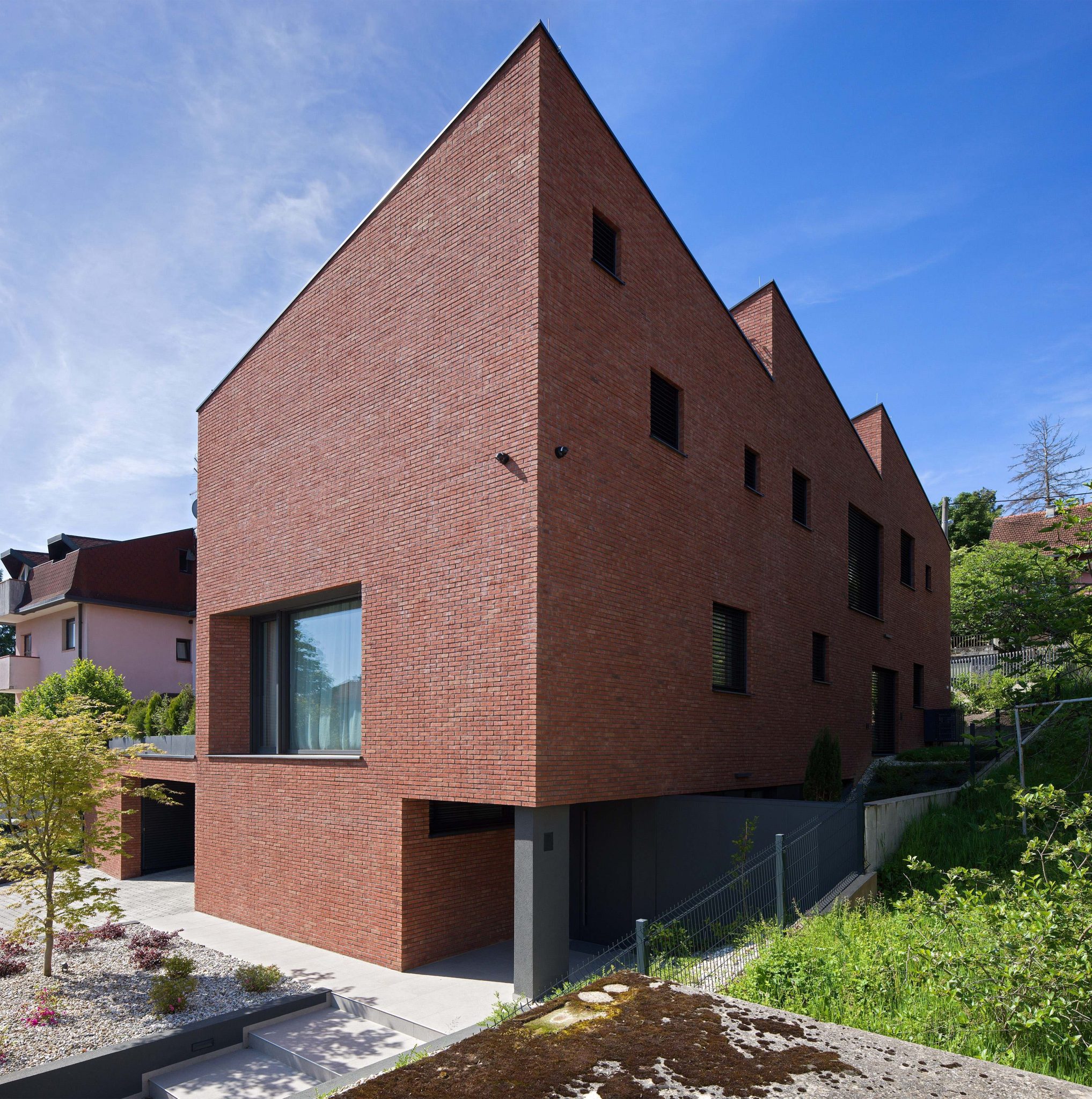 Postavljanjem kuće uz sjeverni rub parcele autori su oslobodili vrijedan južni prostor koji se dodatno oplemenjuje kreiranjem niza otvorenih prostora, uspostavljajući njihovu snažnu povezanost s unutarnjim sadržajima kuće. Ta gesta osjeća se već pri samom ulasku u kuću u najdonjoj etaži, koja je većim dijelom ukopana.