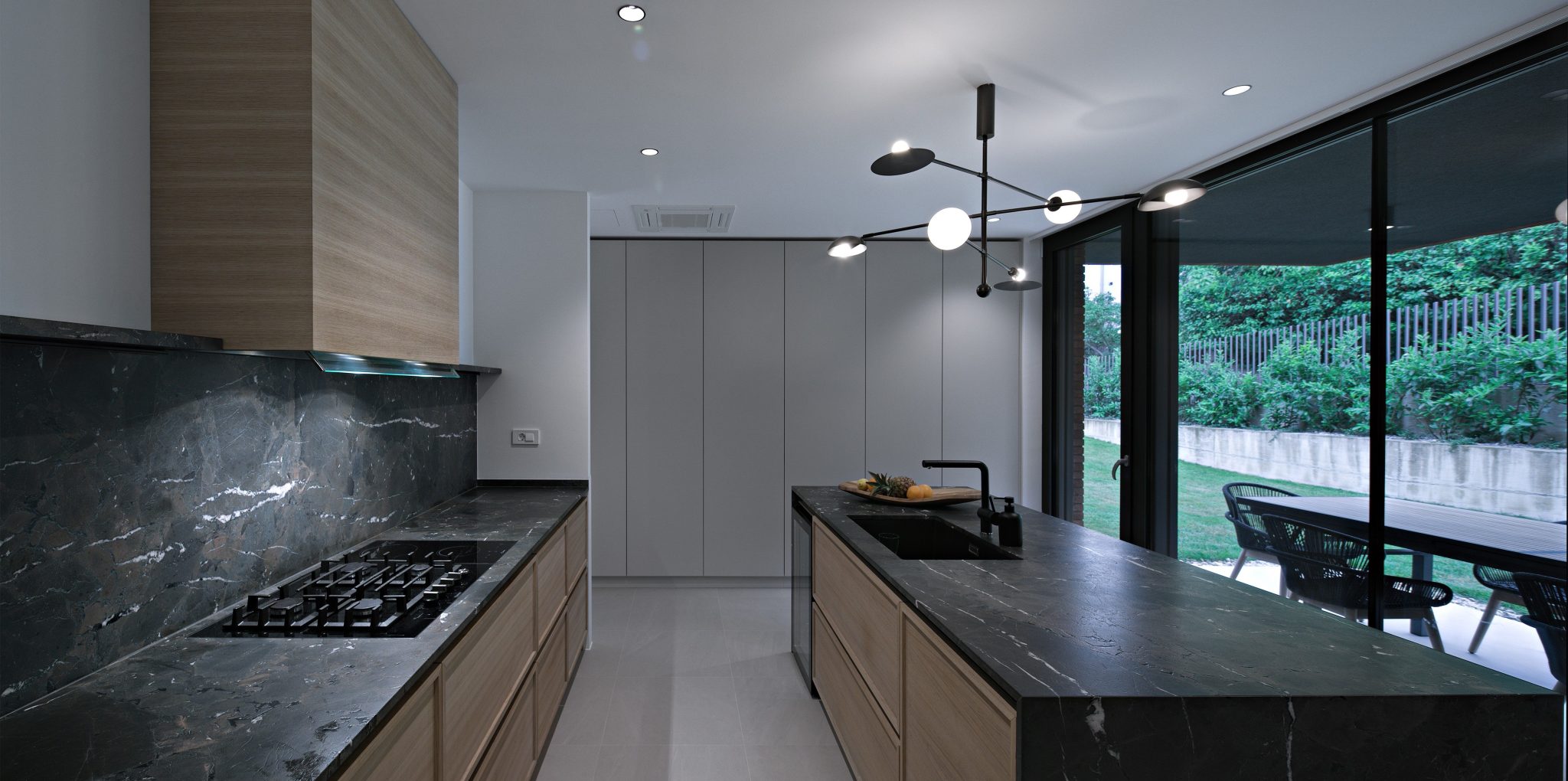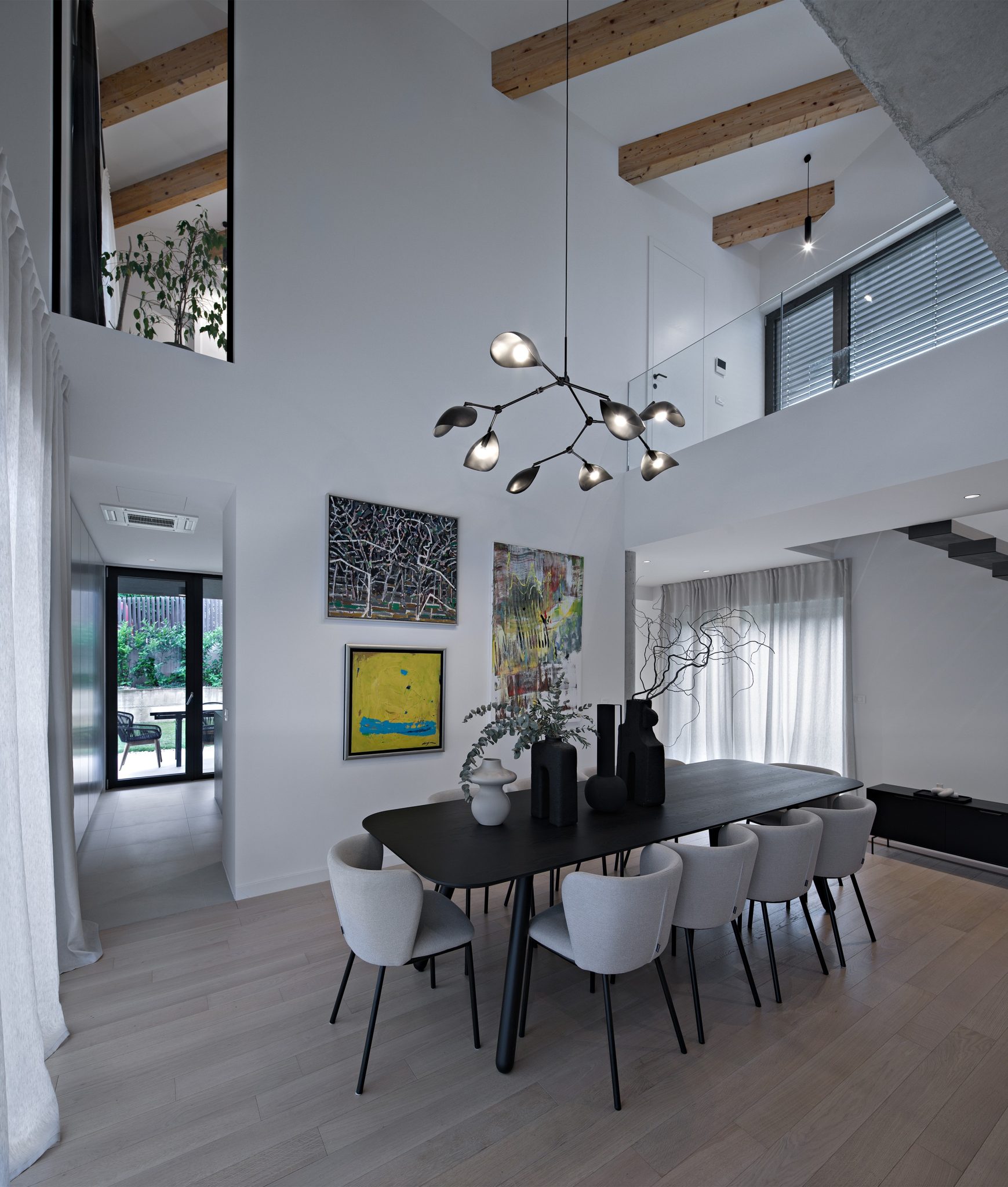 Bočno pridruženi atriji uz ulazni dio te uz prostor bazena omogućuju prirodno osvjetljenje što doprinosi ukupnoj prostorno doživljajnoj kvaliteti. U nastavku naglašeni pravac stubišta vodi na gornju etažu, odnosno piano nobile, koja se sagledava gotovo u svom totalitetu i čija se prostornost gradi svega jednim zidom prema kuhinji te setom mobilijara.