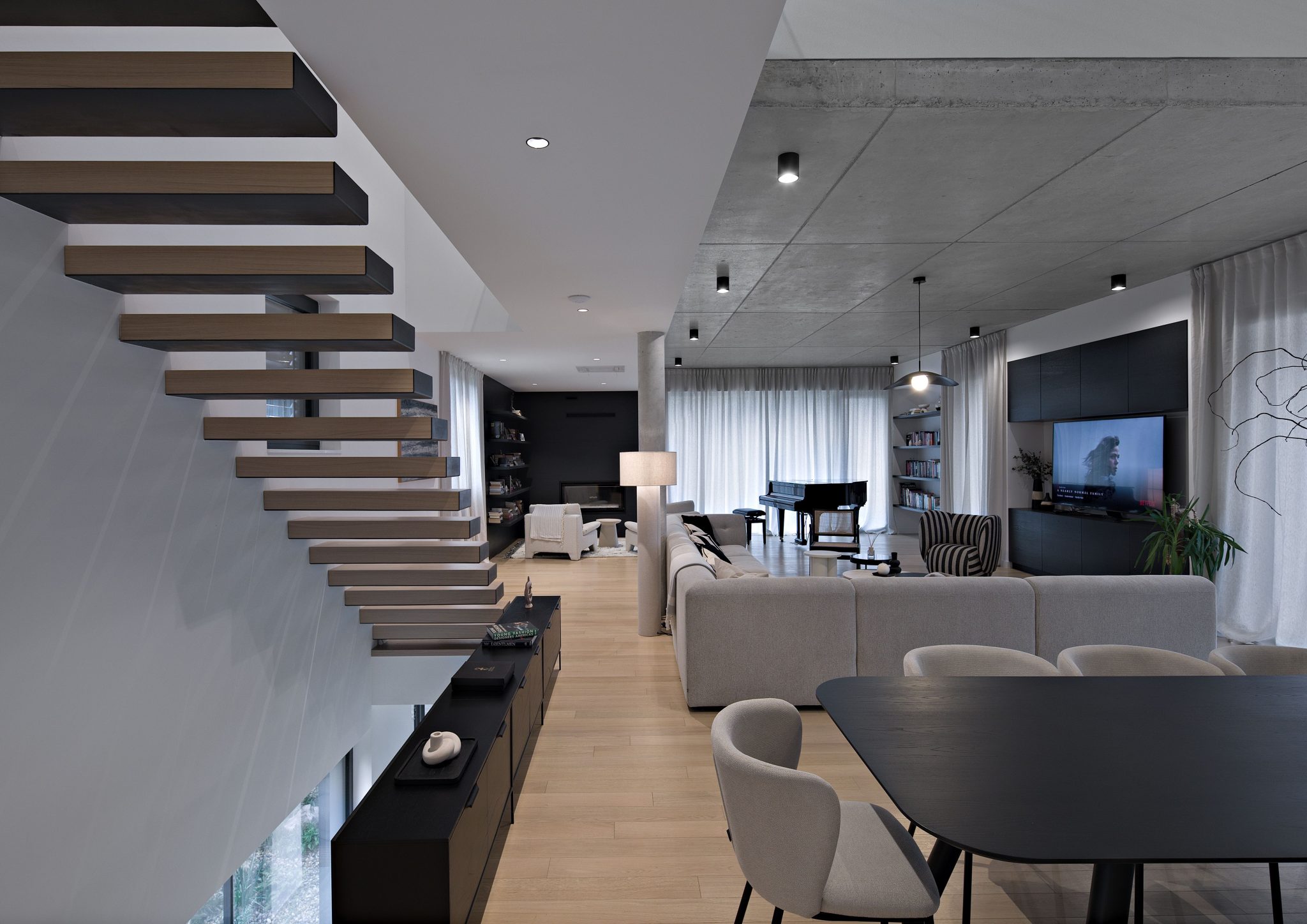 – Na toj etaži fizička i vizualna povezanost s okolnim terenom je najizraženija, a dodatno se nastavlja preko dvoetažnog prostora iznad blagovaonice prema gornjoj etaži spavaćih soba. Drveni lamelirani nosači, vidljivi u dijelu dvoetažnoga boravišnog prostora, osim konstruktivne uloge, doprinose plasticitetu prostora, stvarajući kontrast sa zaglađenom stropnom pločom od vidljivog betona, dio je osvrta na projekt arhitekta i člana žirija za nagradu Drago Galić, Tomislava Solde.