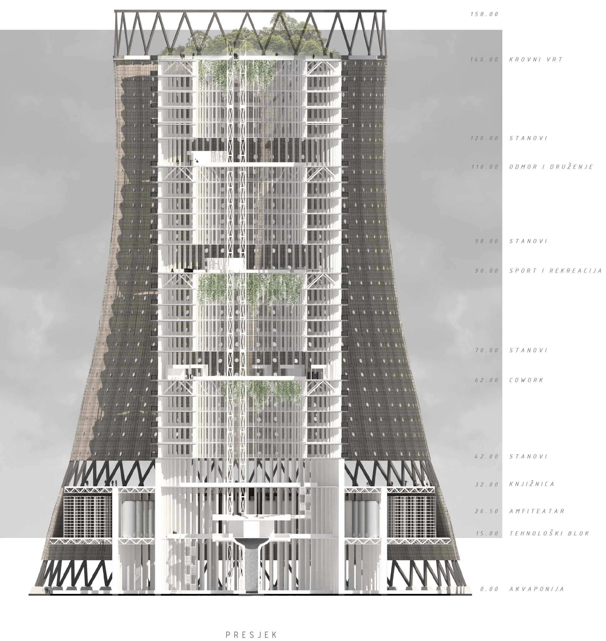 – Rad nastaje u sklopu kolegija Radionica arhitektonskog projektiranja 1 na temu stanovanja u neboderu. Stambeni je toranj umetnut u visoku strukturu ugašenoga nuklearnog tornja u nekoj novoj stvarnosti gdje su granice između čovječanstva i tehnologije zamućene, a visoka struktura nuklearnog tornja pojavljuje se kao svjetionik napretka i simbol našeg potencijala. Društvo je sustav, a sustav je društvo, energija, infrastruktura, zajednica, okoliš, priroda; sustav funkcionira kao neprekidna kružna veza unutar koje svi jednako daju i dobivaju, stoji u opisu rada.