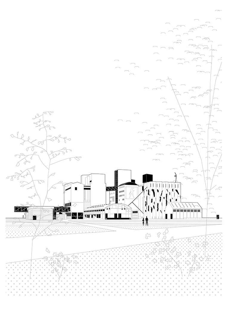 – Oko travnjaka formira se gradski prostor uokviren strukturama s više funkcija kao što su tržnica, najamni prostori i pomoćna zgrada kazališta, ali koje služe i kao nosači platnenog krova koji štiti središnji prostor od sunca i kiše. Krov je vertikalno pomičan i omogućava prilagodljivost različitim događanjima. Plohu trga oko travnjaka čini betonski plato u nagibu opremljen podnim prskalicama za ispiranje i zalijevanje, stoji u opisu rada na internetskim stranicama UHA-e.