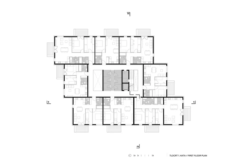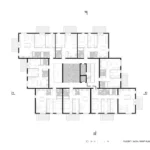 Stambena zgrada s 30 stanova osmišljena je tako da stanarima pruža intimu. Na najvišoj etaži odabrano je rješenje uvučenih terasa koje funkcioniraju kao ‘patio’ da bi se poštivao propis manje izgrađenosti na vrhu objekta. u tom smislu rješenje je često ravnomjerno ‘uvlačenje’ etaže tako da se dobije jedna terasa pa se ne dobiva ista razina privatnosti. Osim pravila zadnjeg kata, projektanti su se morali prilagoditi još nekim ograničenjima.