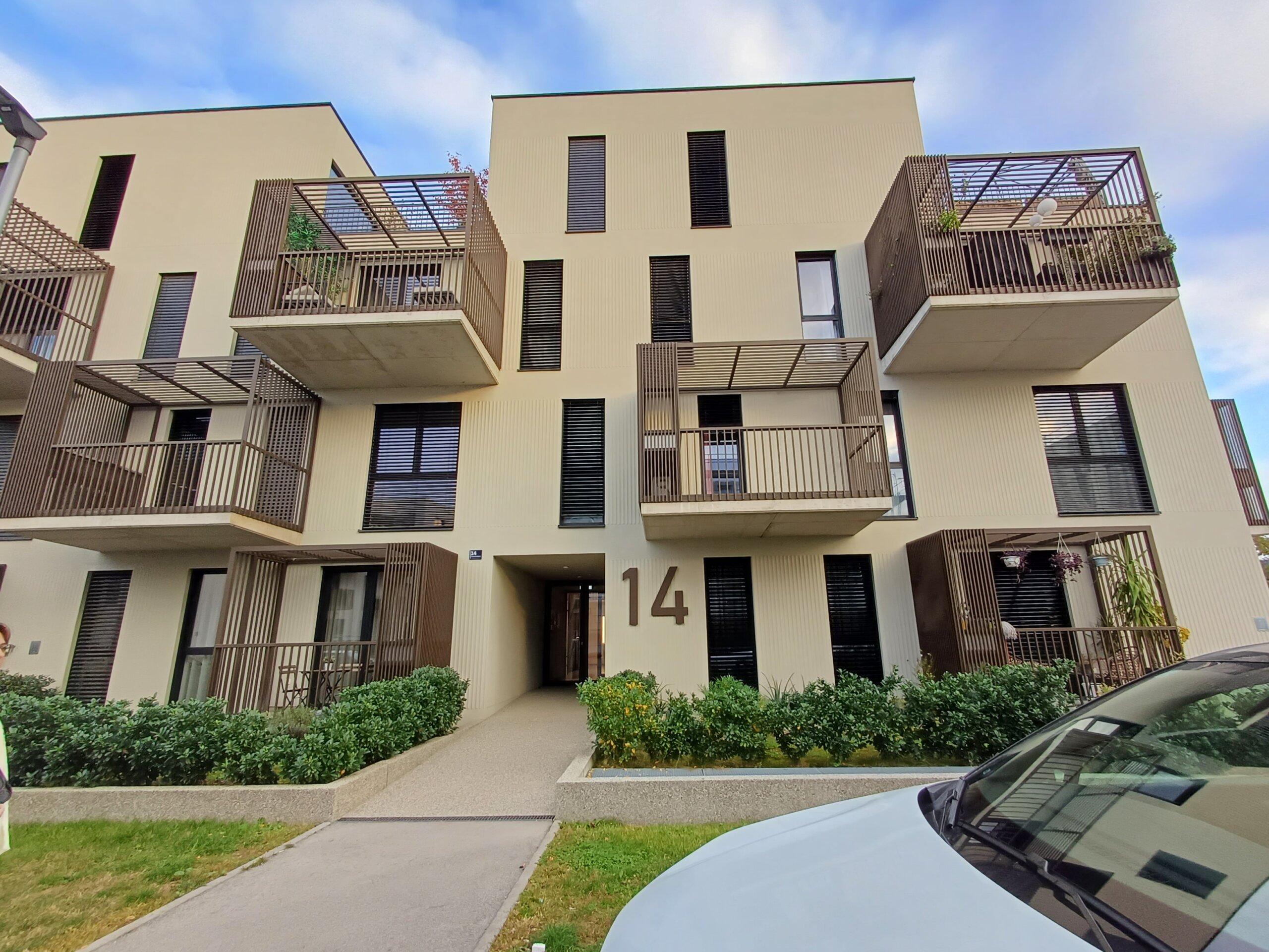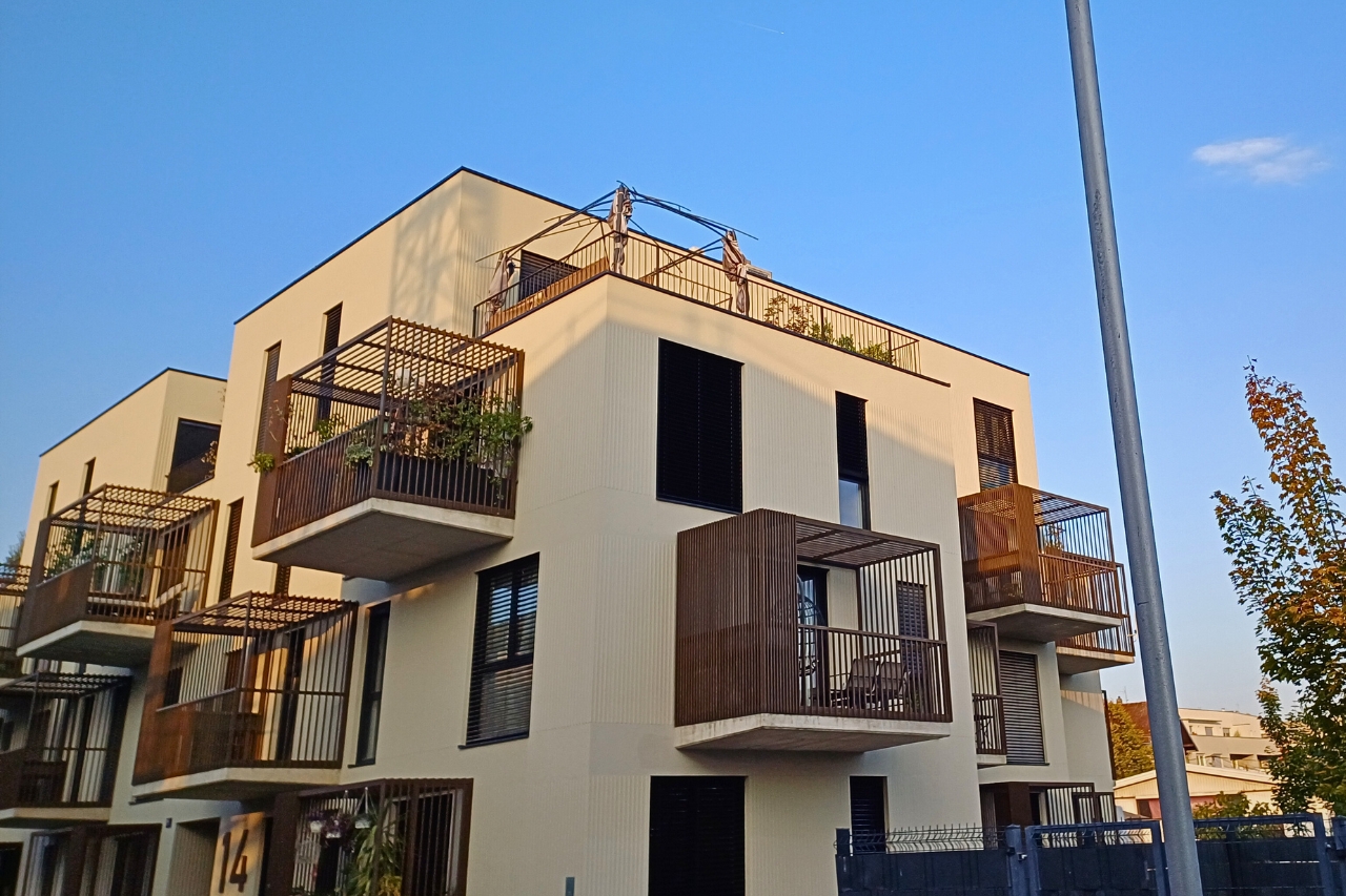 Unatoč tome što je visoka izgrađenost parcele, stanari i dalje mogu uživati u balkonima koji su, pored fasade, najveća specifičnost ovog stambenog objekta. Na fasadi su izvedene ‘kanelure’, a balkone krase rešetkaste i ručno rađene pergole.