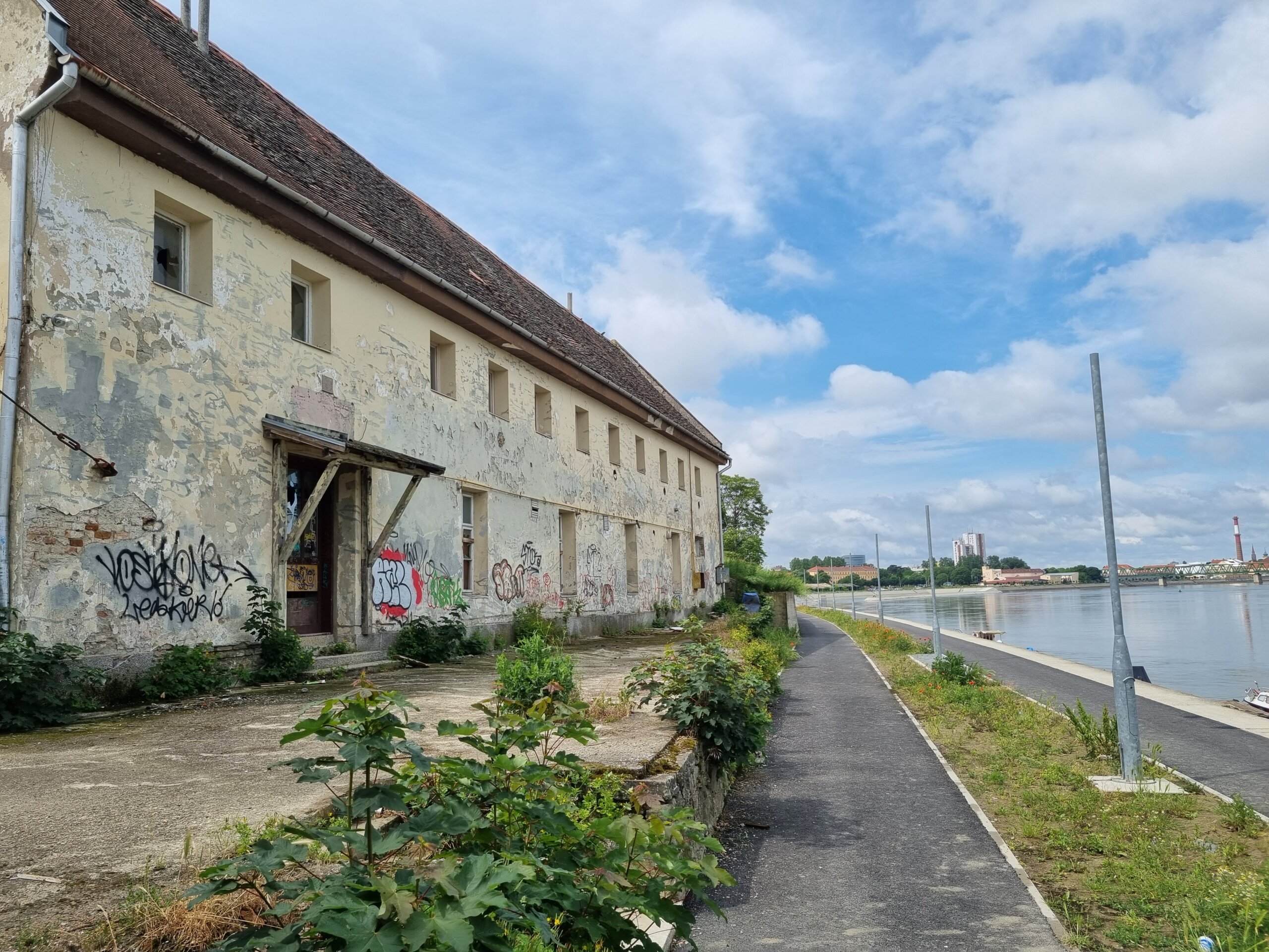 I tu je upravu. I mi smo htjeli popiti kavu pa smo na kraju završili u tom jednom restoranu s pogledom na Dravu, ali, s lijeve strane i na prvog susjeda – zgradu starog ‘Ribarskog doma‘ za koju Roguljić tvrdi da bi bio pun pogodak revitalizirati.