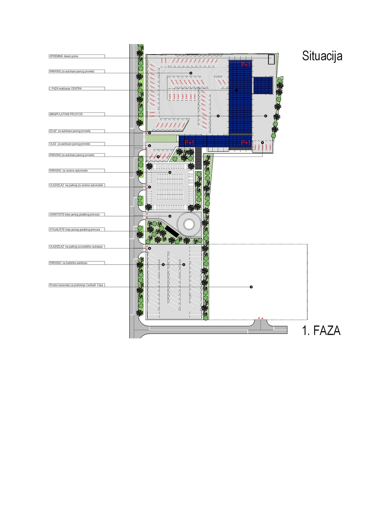 Programskim idejnim rješenjem prve etape izgradnje na površini od 22.600 m2 predvidio se prostor za parkiranje i smještaj 50 autobusa javnog gradskog prijevoza i 80 osobnih automobila. Zatim punionice za diesel gorivo i za struju, adekvatnog kapaciteta i režima rada za potpuno zadovoljenje potreba navedenog broja autobusa, praonica kojoj mogu pristupiti i drugi autobusi, poput turističkih, stanica za tehnički pregled, odnosno kontrolu tehničke ispravnosti vozila, prostori za sve faze servisa vozila i održavanja vozila.