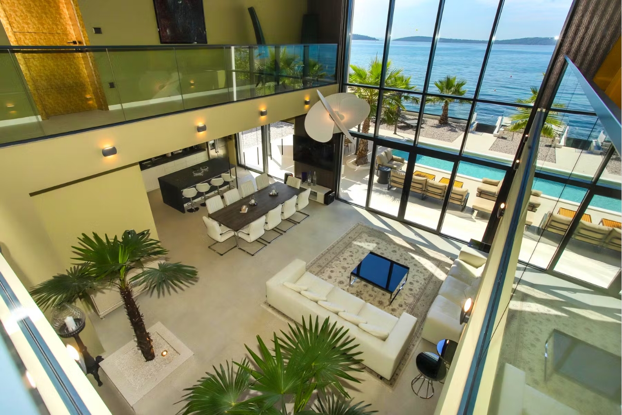 Nakon ulaska na prizemnu etažu, najuočljiviji je prostrani dnevni prostor koji spaja kuhanje, objedovanje i druženje. Riječ je o trendi kompleksu open space-a koji povezuje kuhinju, blagovaonicu i dnevni boravak. Raskošna prostorija okupana je svjetlom prozora koji se prostire od poda do stropa i kroz koji se pruža spektakularan pogled na more.