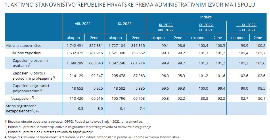 Broj nezaposlenih je ovaj mjesec pao za 4,2%, a broj nezaposlenih žena za 0,8% – stopa registrirane nezaposlenosti u rujnu 2022. iznosila je 6,1%, a kada su u pitanju žene, 7,4%. Svakako je pozitivna vijest to što je za razdoblje od siječnja do rujna 2022. godine, broj zaposlenih porastao za 1,4%, a odnosno 1,7% za žene. Detaljnije podatke možete pronaći na grafovima i u tablicama.