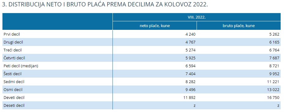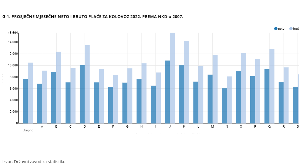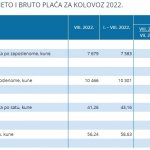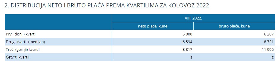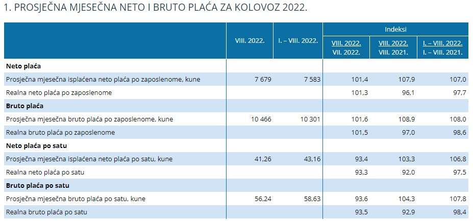 Za razdoblje od siječnja do kolovoza 2022. prosječna mjesečna isplaćena neto plaća iznosila je 7.583 kune, dok je bruto plaća iznosila 10.301 kunu. To je u odnosu na isto razdoblje 2021. nominalno više za 7,0%, a realno niže za 2,3%, odnosno nominalno više za 8,0%, a realno niže za 1,4%.