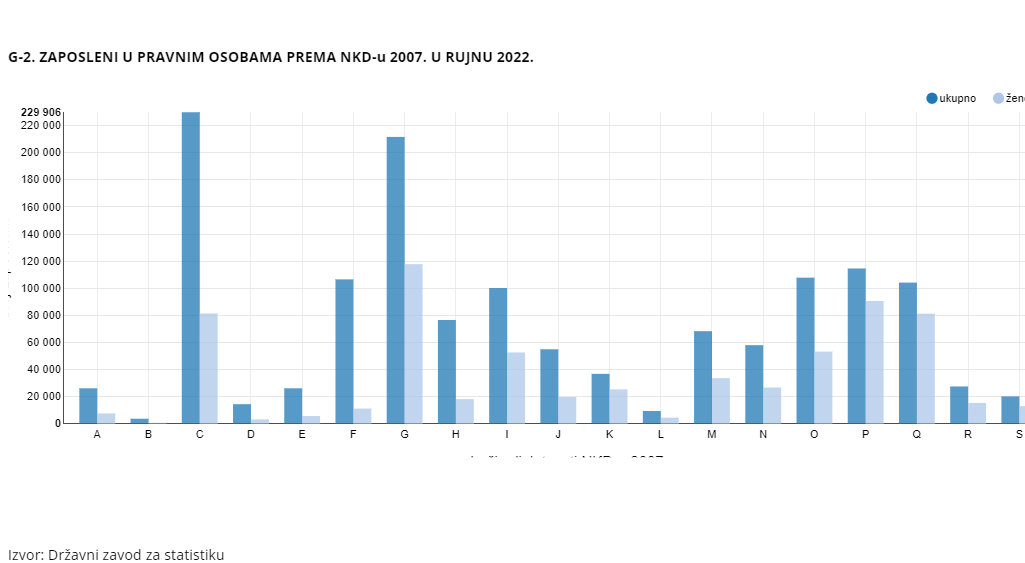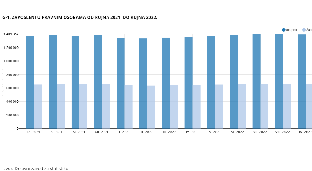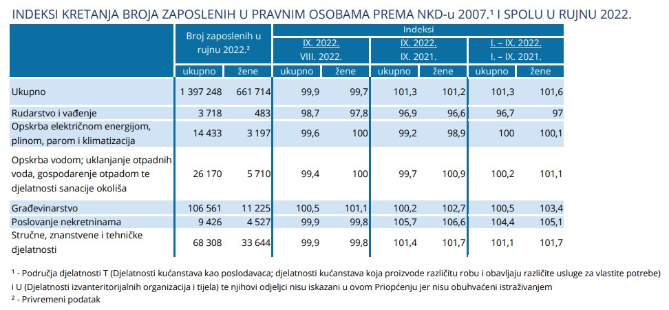 U rujnu 2022. godine broj ukupno zaposlenih u Republici Hrvatskoj iznosio je 1.621.308, od čega 755.562 čine žene. U odnosu na prethodni mjesec, došlo je do pada od 0,7%, a odnosno 0,8% za žene. No, kada se uspoređuju podatci s prošlogodišnjima, ovaj rujan je bolji – broj ukupno zaposlenih je porastao za 1,3%, a broj zaposlenih žena za 1,2%. Broj zaposlenih u obrtu i slobodnim profesijama je u odnosu na prethodni mjesec pao za 4,0%, a odnosno za žene za 4,7%. U građevinarstvo je zaposleno 106.561 ljudi, od čega ih je 11.225 žena.