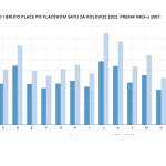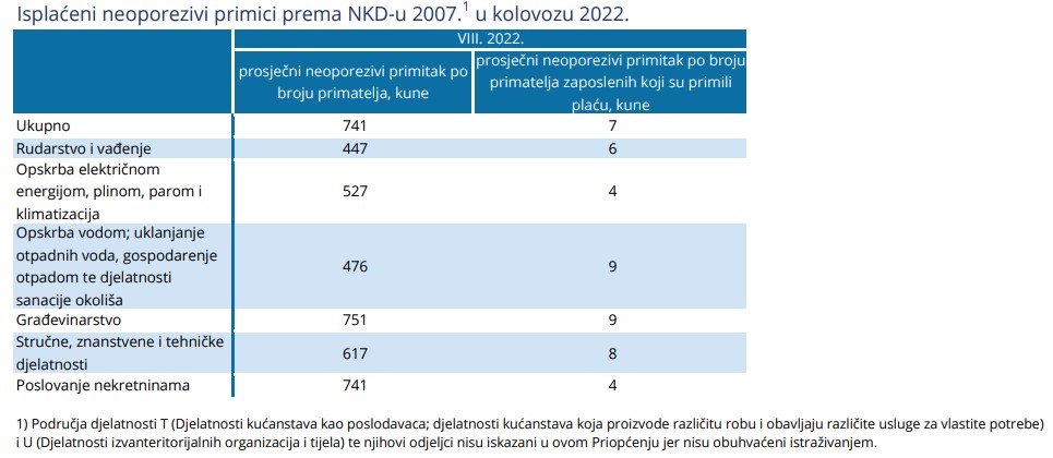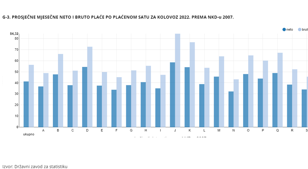 U kolovozu 2022. bila su prosječno 183 plaćena sata, što je 9,6% više negoli u prethodnom mjesecu. Neto satnica je u kolovozu 2022. godine iznosila 41,26 kuna, što je manje negoli u prethodnom mjesecu, i to za 6,6%. Ipak, vidljiv je porast u odnosu na kolovoz 2021. godine – viša je za 3,3%. Porasla je i bruto satnica, koja je u kolovozu 2022. godine iznosila 56,4 kune – 6,4% niže negoli u srpnju, a 4,3% više negoli u kolovozu 2021. godine,