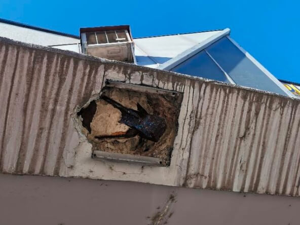 Što se tiče oštećenja, fotografije s terena pokazuju manja oštećenja na sidrenju zatege 1 u beton nadstrešnice te pojavu korozije na toj i drugim zategama, što potvrđuje više fotografija čeličnih ‘šipki’. Kako je navedeno ispod još jedne fotografije koja prikazuje zatege 3 i 4, ‘na donjim trežinama zatega skinuta je zaštitna obloga i na dostupnim površinama može se uočiti dotrajavanje te opet, ljuštenje AKZ-a i korozija čeličnog profila.