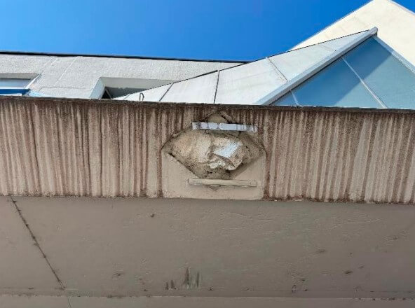 – Tragovi vlaženja na vanjskom rubu cijelom duljinom nadstrešnice/Vlaženje s izluživanjem u podgledu nadstrešnice/Tragovi curenja na vanjskom rubu ploče, vlaženje i izluživanje u podgledu/Detalj izluživanja i procurivanja u podgledu ploče opisi su ispod slika koje pokazuju navedene probleme na pročelju.