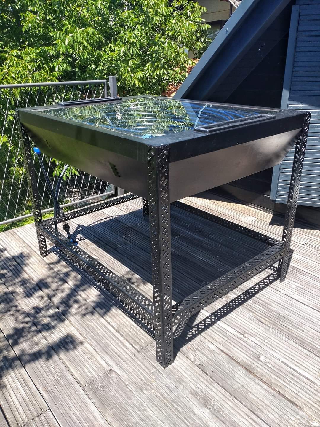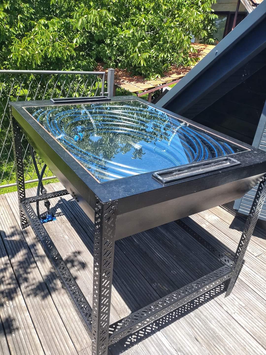 U pitanju je instalacija napravljena od starog grafičkog, crtaćeg, montažnog stola. U stol je namotano oko sto metara fi32 i fi25 okiten cvijevi. Nije bilo niti originalnih noga od stola, pa se i po tom pitanju autor ‘kolektora’ snašao s DIY metodom. Stol je napravljen tako da u njega ulazi voda iz vodovoda, a dalje je klasično razvedena kao topla voda na svim slavinama. Cijeli sistem je pod tlakom, a temperatura vode iz slavine iznosi oko 65°C.