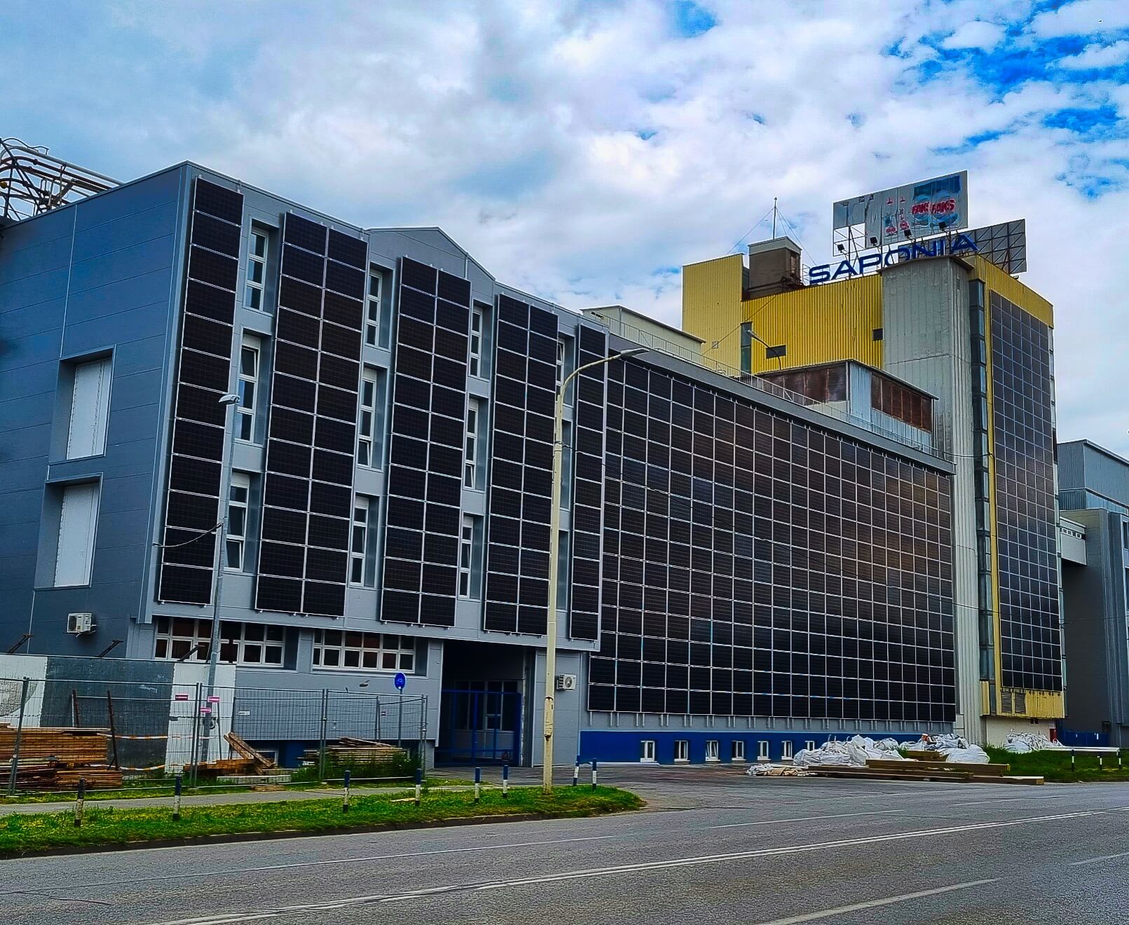Nova vizura osječke ‘Saponije’, pročelje tvornice prekriveno vertikalnim solarnim panelima 9. lipnja 2023.
