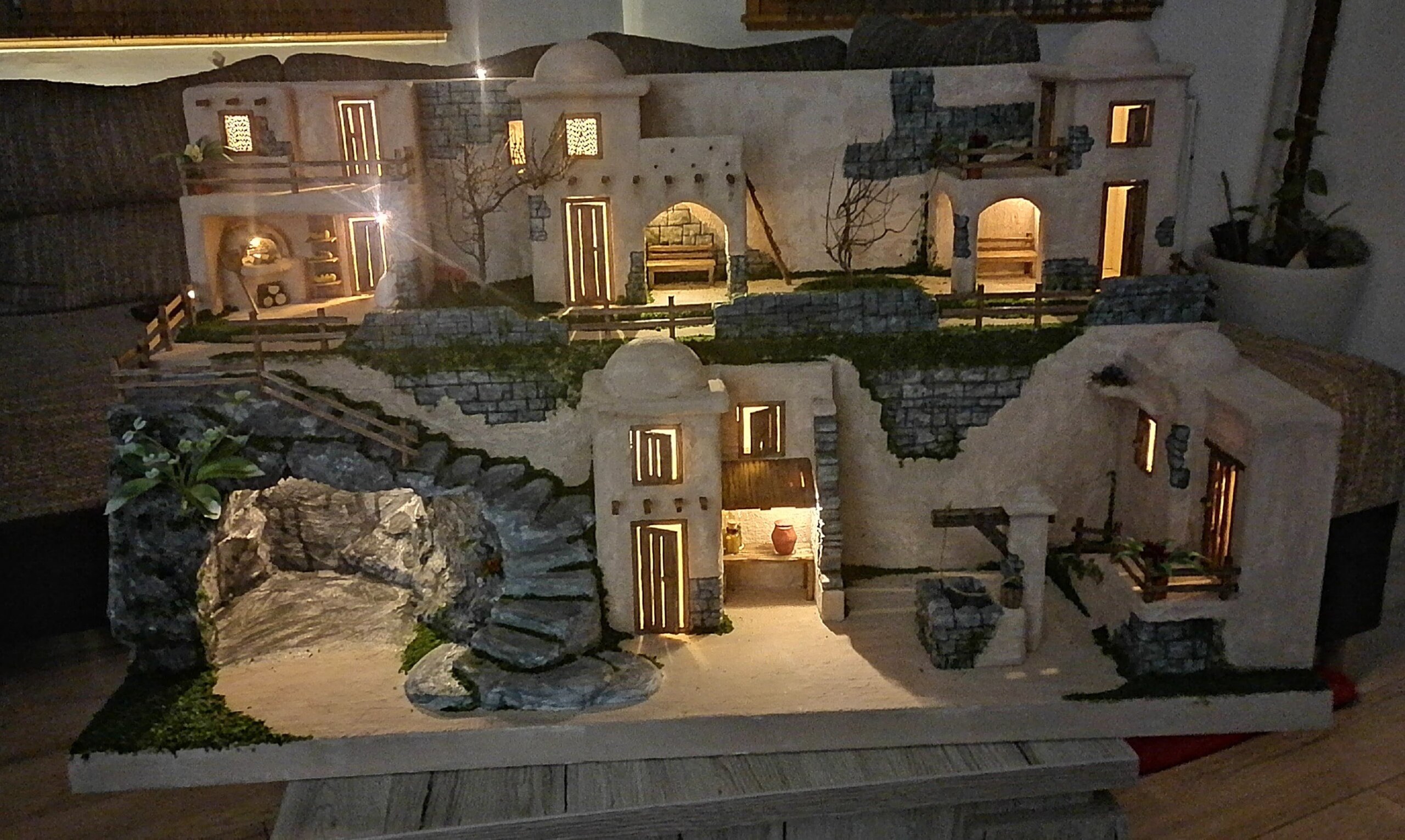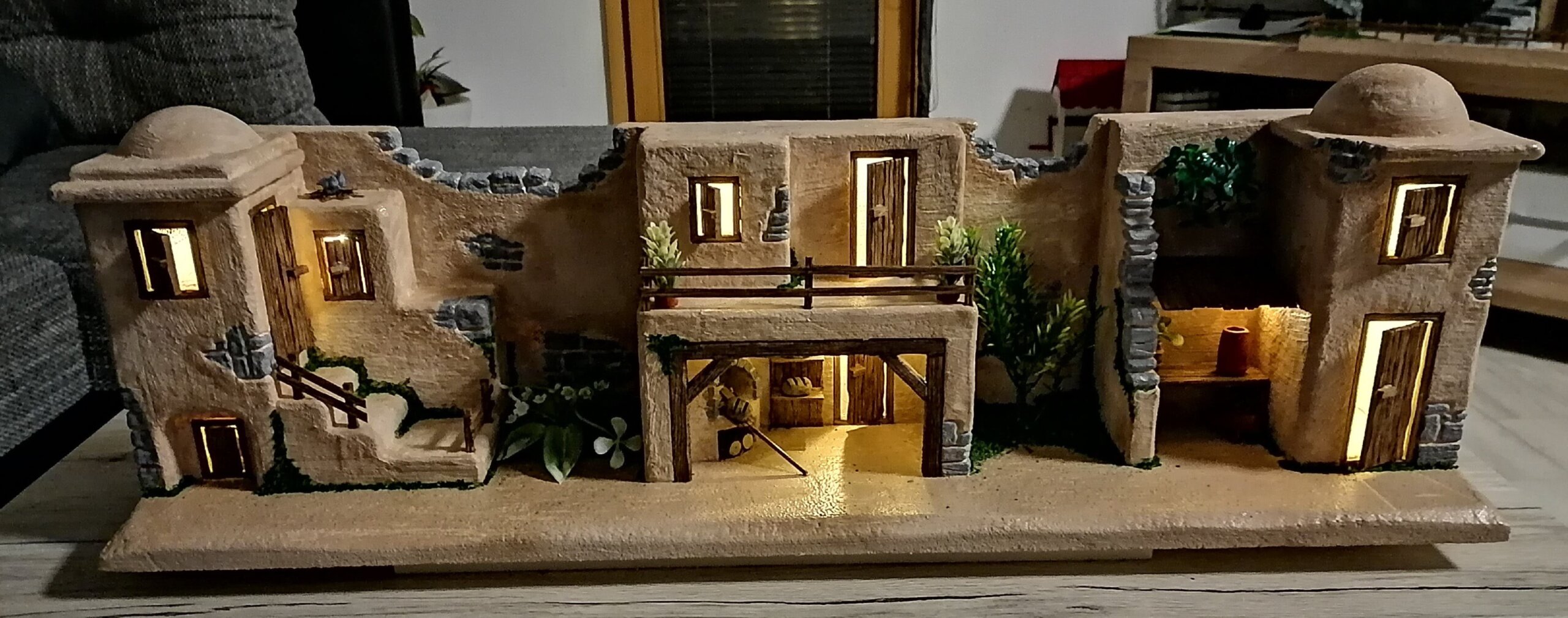 – Za precizan rez, mislim na spojeve zidova, ako zidovi nisu ravni, bježe i budu na koso, s rezačem sada ide sve po ‘pe esu’. Ciglice ili kamen, kamene blokove, izrezujem malom lemilicom i onda rubove dodatno obradim preciznim skalpelom. Kada je kućica završena i oblikovana premažem je, ili glet masom ili ljepilom za pločice i onda slijedi bojanje. Fasade kućica bojama razrijeđenim Jupolom u koji dodajem tonere DIPI-ja, smeđi najčešće. Za ostale detalje, primjerice mahovine ili plijesni po zidovima ili kamenu, koristim akrilne boje. Za efekte trave koristim samljevenu suhu mahovinu. Prije sam u svakoj kućici ostavljao rupicu kroz koju se uvlačila lampica, a sada ugrađujem ‘ledice’. Ako je rad veći i s više kućica, onda sve ledice povežem u jedan niz i spojim na 220 adapter, pojasnio nam je Mario cijeli proces izrade.