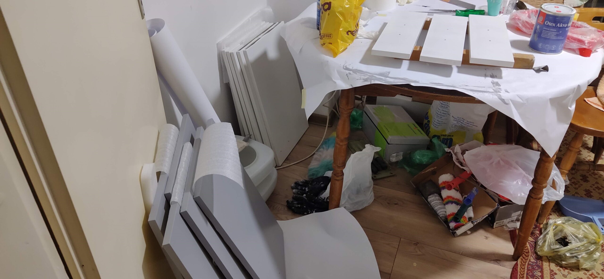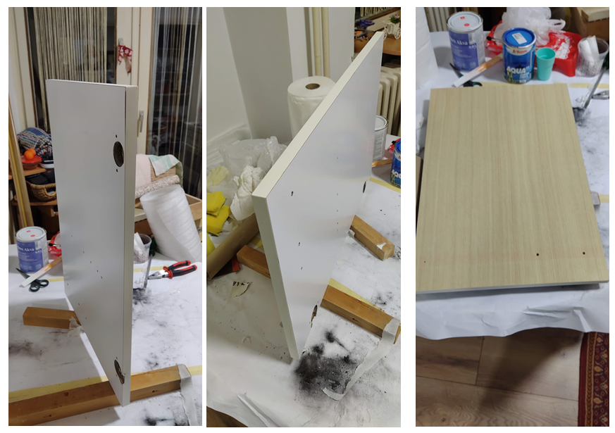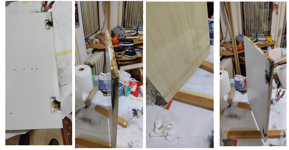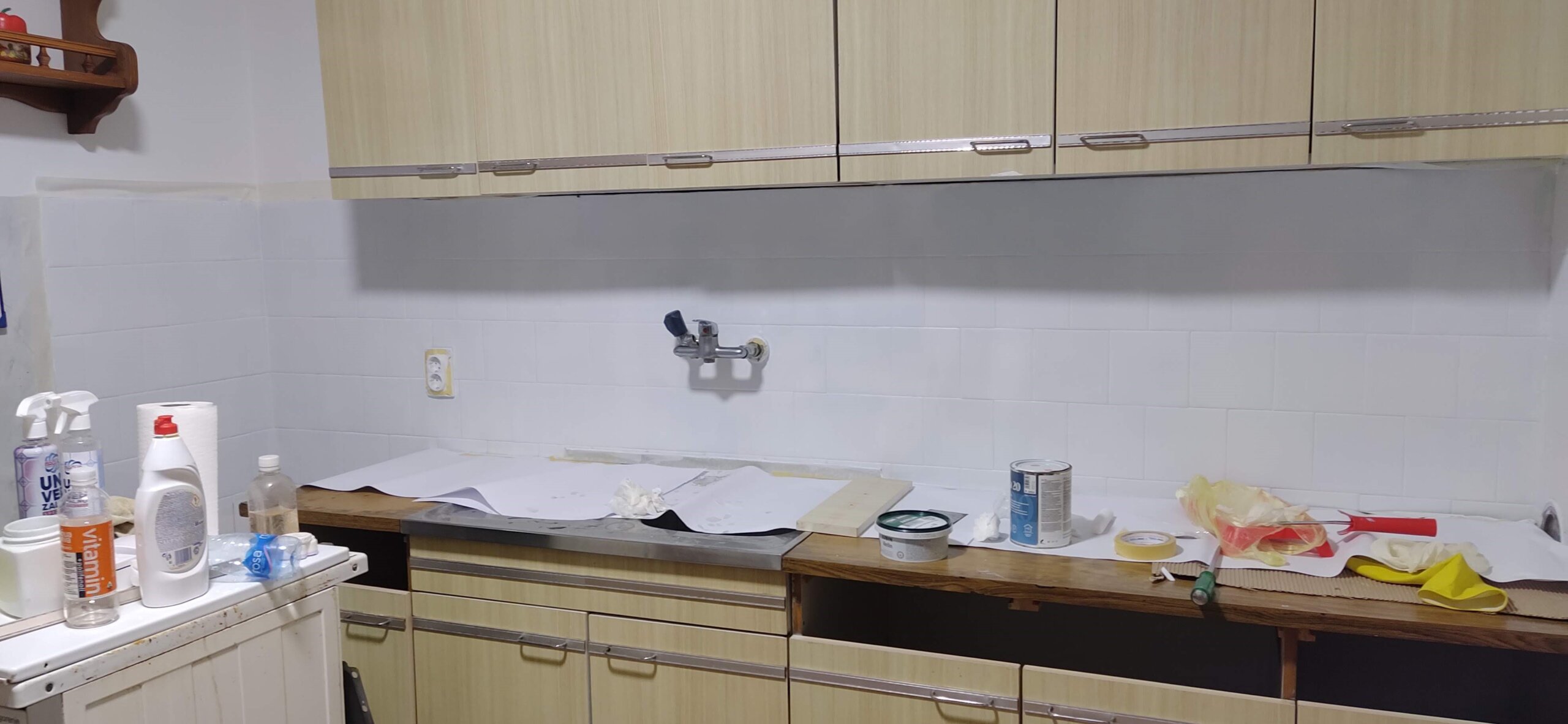 Tada je odlučio krenuti u avanturu bojanja kuhinjskih elemenata – izvana i iznutra, Kupio je preporučene akrilne boje na vodenoj bazi, valjke s mikrofibrnim vlaknima i četkice za akrilne boje. Sve se to odvijalo u kuhinji, gdje je na kuhinjskom stolu napravio radnu površinu.