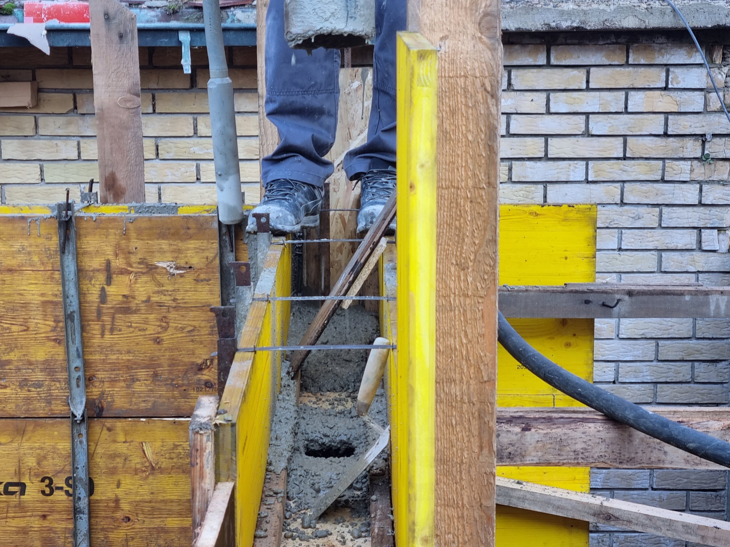 Zadnji kraj beton pumpe centriran je iznad otvora na oplati i punjenje je započelo, sloj po sloj, cijelom dužinom pravca budućeg potpornog zida, kada je u pitanju dubina približno 50 centimetara po 50 centimetara. Nakon što je svaki sloj izliven, u beton se potapao valjak ili stroj za nabijanje – pervibrator koji je istiskivao zrak iz smjese kalupa, odnosno koji je beton pravilno raspoređivao kako u njemu ne bi bilo rupa što ga čini nestabilnim.