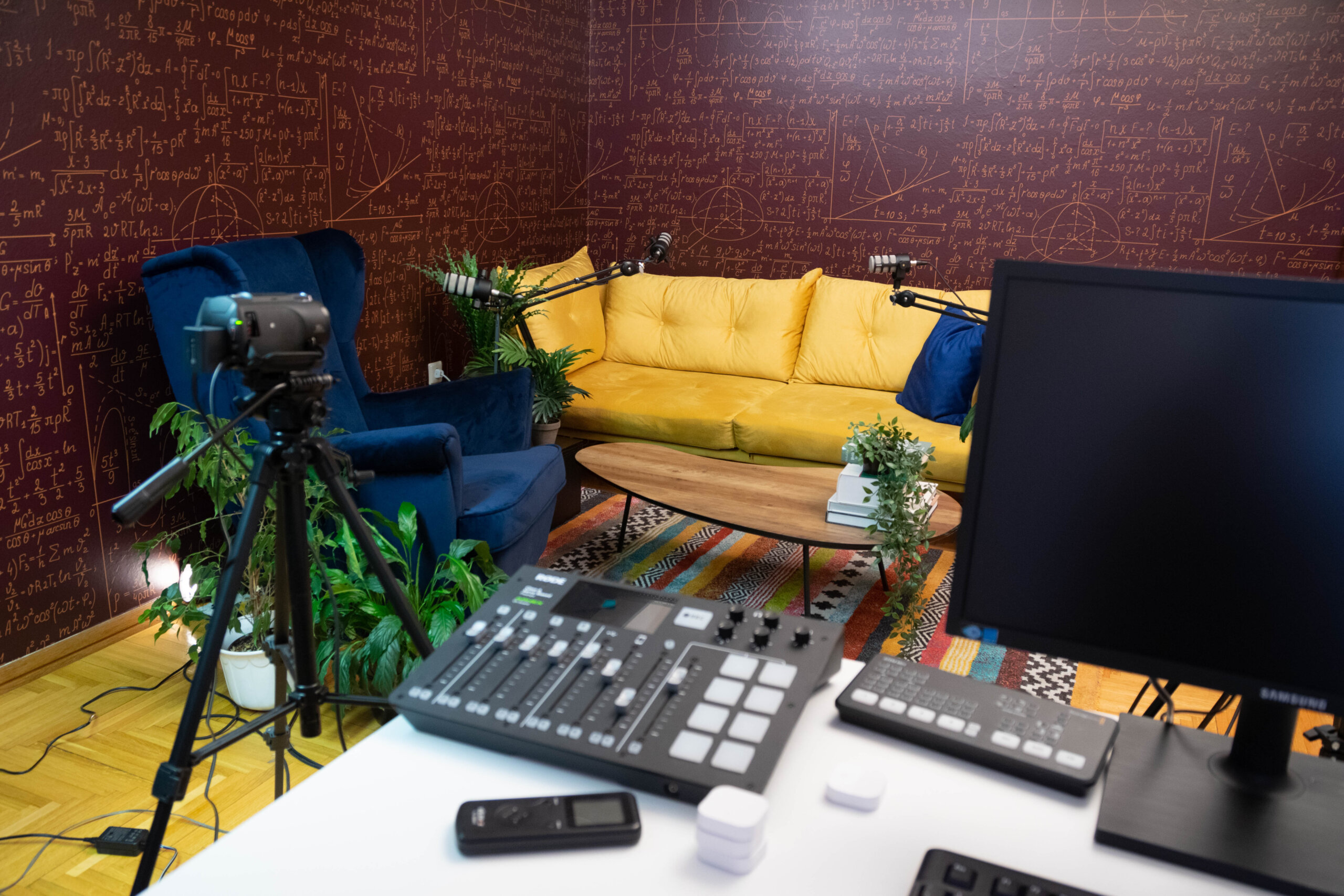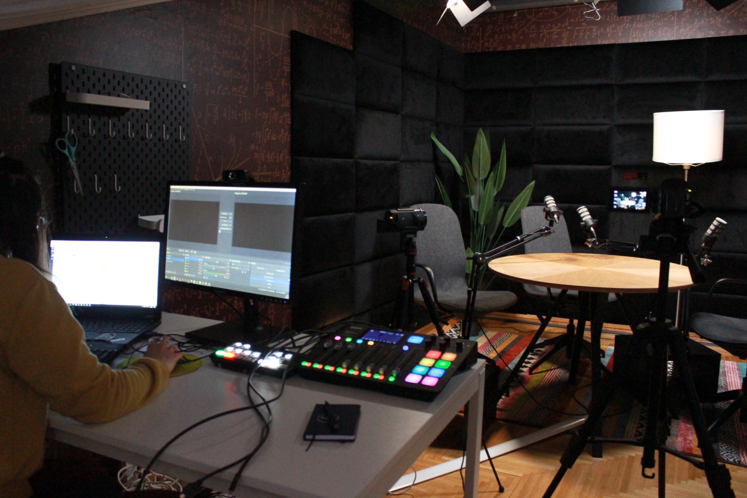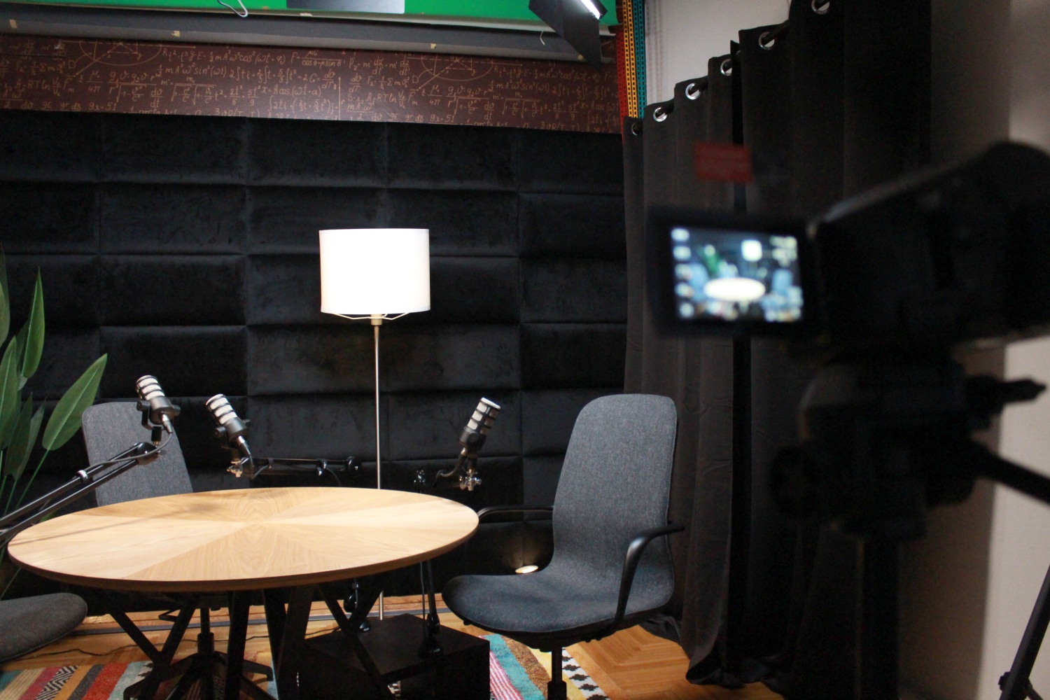 Krenuli smo u potpunu renovaciju interijera studija – umjesto žutog kauča i plave fotelje, odlučili smo se za okrugli stol i stolice, a zidne tapete s matematičkim formulama odlučili smo zamijeniti crnim plišanim zidnim panelima. Osim toga, studio smo opremili i foto platnima u bijeloj, sivoj i zelenoj boji.